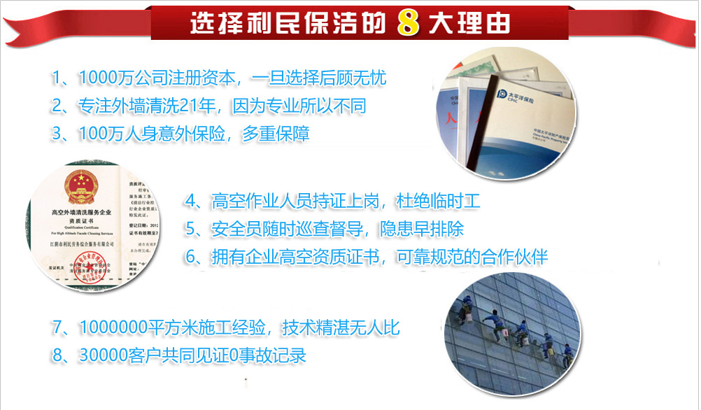 ![]() 利民,高空清潔行業(yè)的卓越領(lǐng)跑者。我們的外墻清洗業(yè)務(wù)包括:外墻清潔、外墻防水補(bǔ)漏、外墻涂料粉刷、LED樓體亮化工程高空安裝、外墻防水工程高空施工等系列高空作業(yè)項(xiàng)目,是物業(yè)公司、景觀工程公司、廣告公司、建筑、安裝公司、幕墻公司、各企事業(yè)單位等最佳高空作業(yè)服務(wù)專業(yè)供應(yīng)商.專業(yè)安全高效,承包高空外墻清洗,.專業(yè)的施工團(tuán)隊(duì),所有人員均持證上崗,高空人員均購(gòu)買100萬(wàn)保險(xiǎn),21年1000000平方的外墻清洗經(jīng)驗(yàn),優(yōu)質(zhì)的服務(wù)..[詳細(xì)] 經(jīng)典案例更多 >
